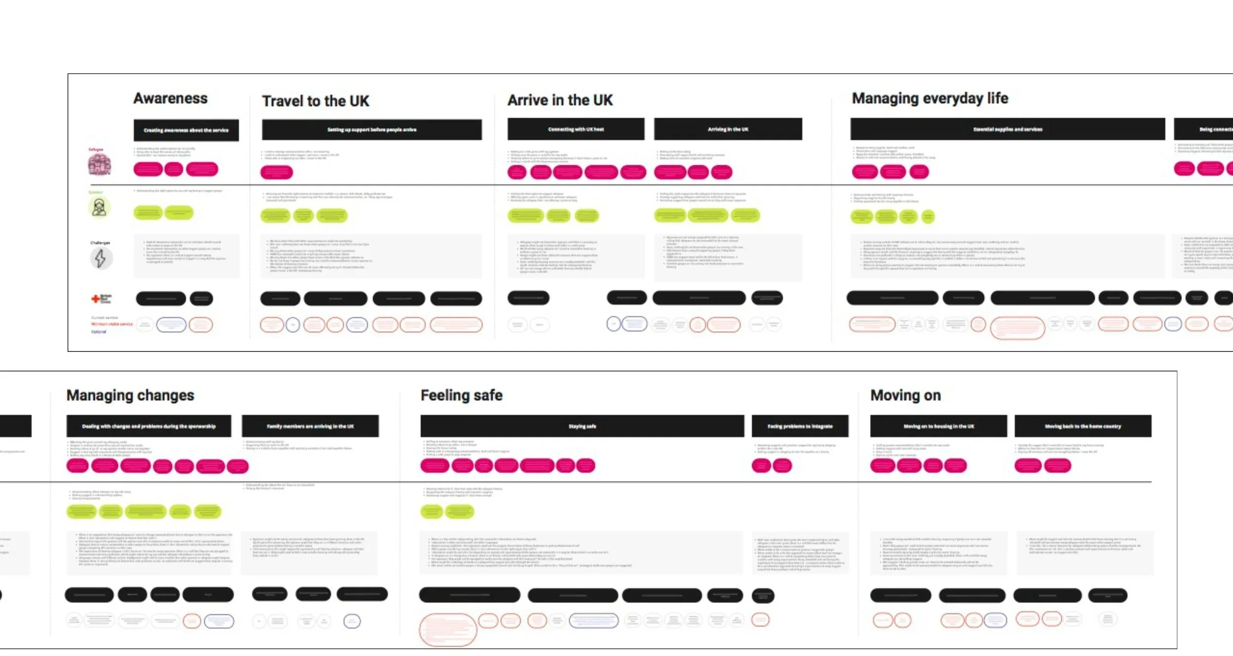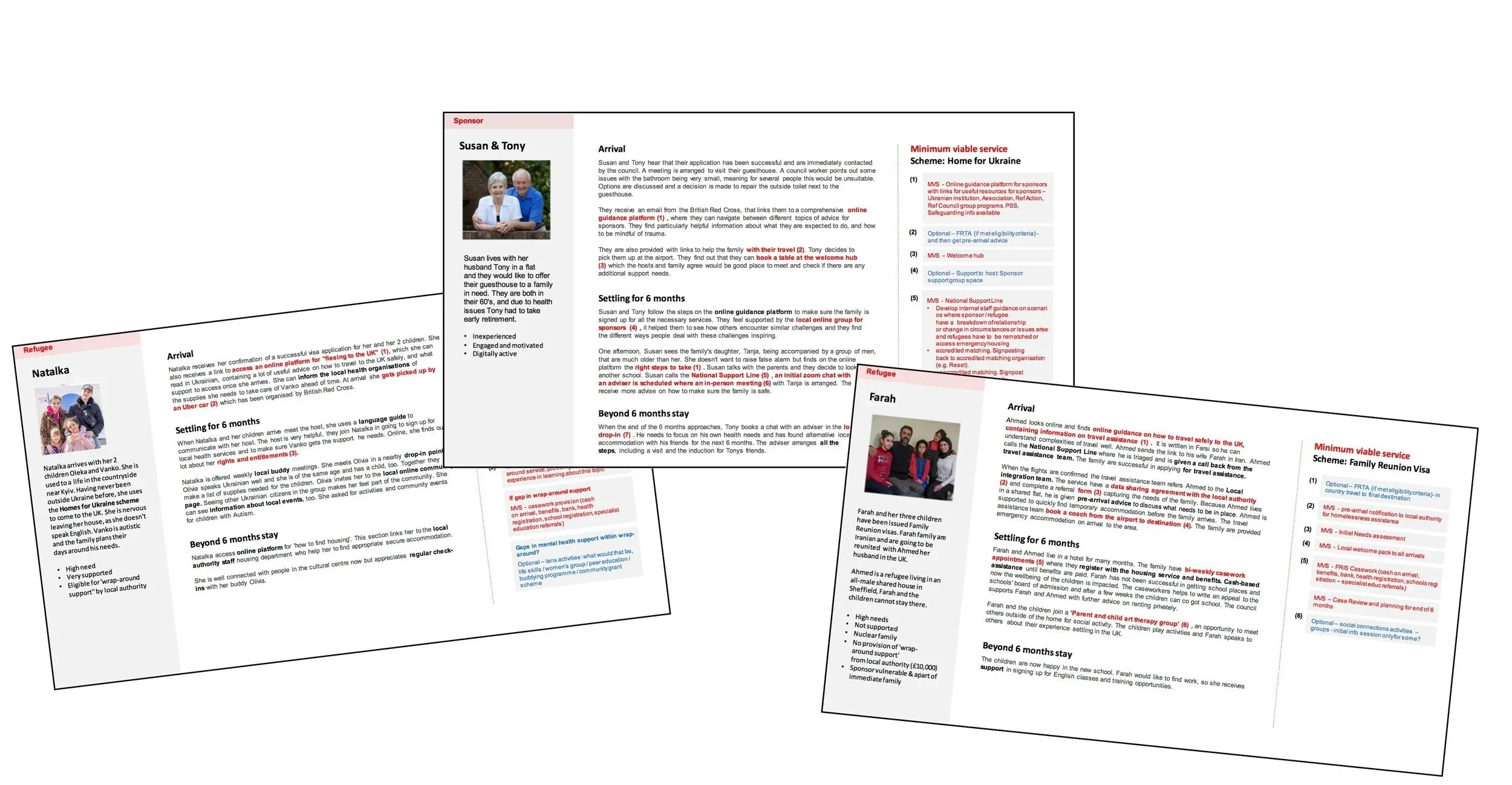 In einer Scoping-Phase mit den zentralen Fachbereichen, die Menschen nach ihrer Ankunft im UK unterstützen, haben wir die aktuelle Nutzerreise („As-is“) analysiert, um Lücken in der Betreuung bestimmter Gruppen zu identifizieren. Ich unterstützte das Team bei der Erstellung einer Roadmap mit Arbeitspaketen. Ein Schwerpunkt war die Entwicklung eines digitalen Selbsthilfe-Angebots für Geflüchtete, damit sie sich eigenständig informieren können. Das betrifft sowohl verschiedene Aspekte der Webseite, wie eine Online Orientierungs Platform die zielgerichtete Information präsentiert, basierend auf einer Frage‐Antwort’Interaktion. Weiterhin wurden Ideen getested, um eine größere Reichweite für die Unterstützung zu erlangen: Geschulte Gemeinden, reguläre Drop‐In Sessions in der Nachbarschaft etc. So gewinnen Mitarbeitende Zeit, um sich auf Menschen zu konzentrieren, die persönliche Unterstützung besonders benötigen.